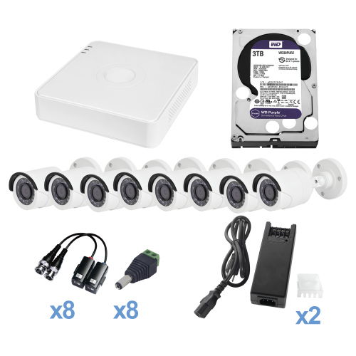 All in One HIKVISON TVI CCTV Kit / Includes 1 PURPLE 2TB HARD DIRVE, 720p 8 Channels DVR (P2P Compatible) / 8 Bullet Cameras